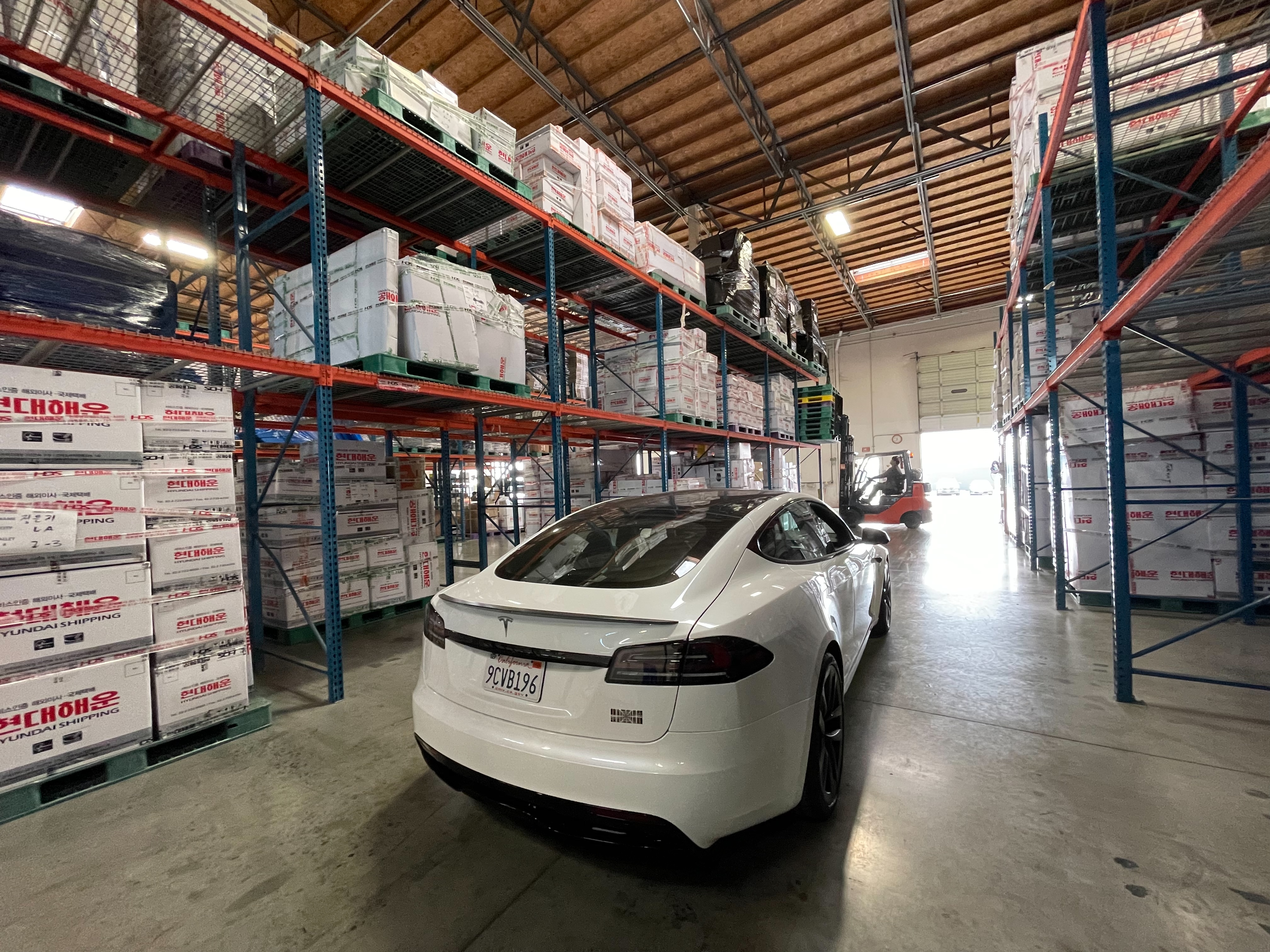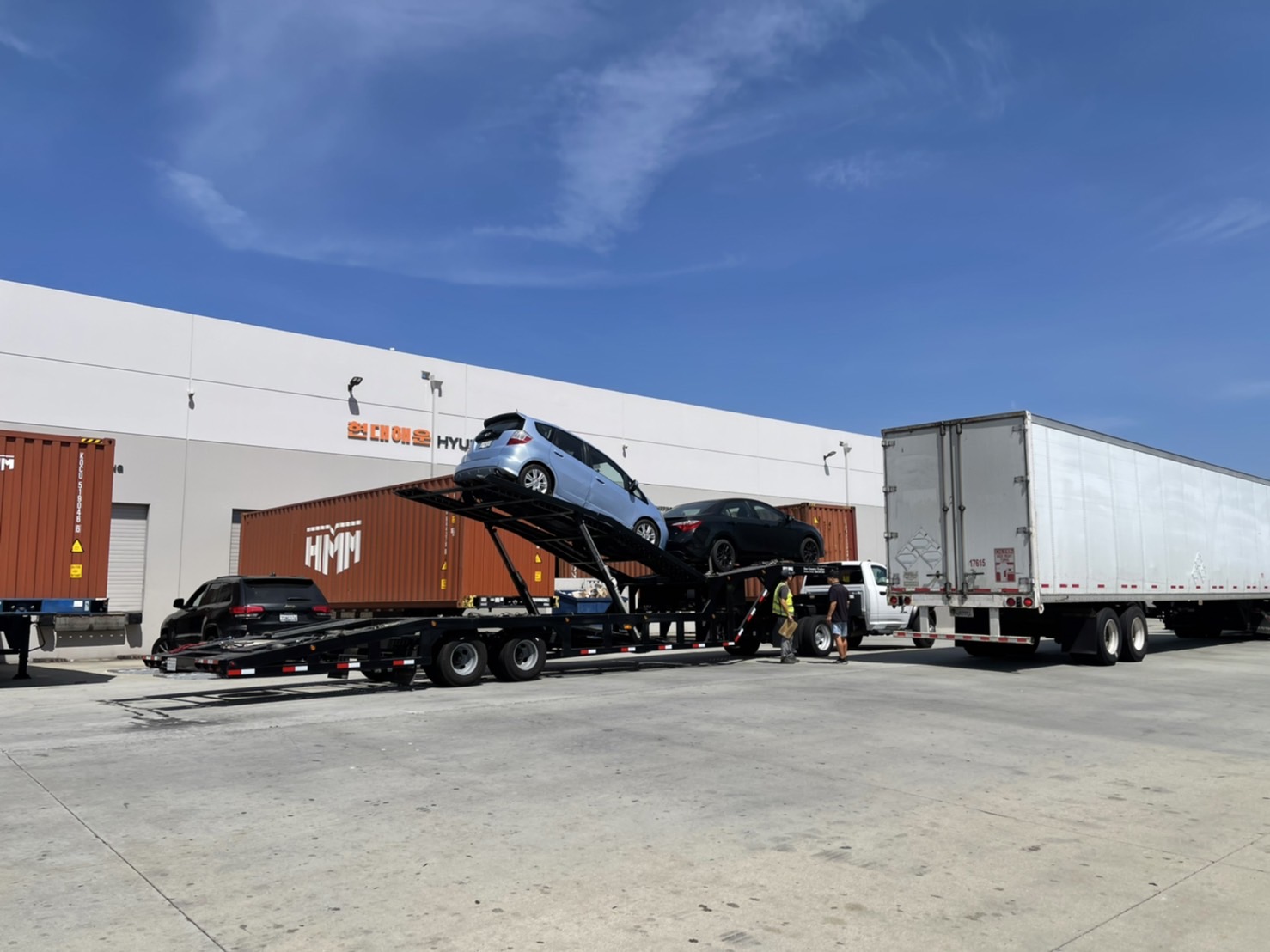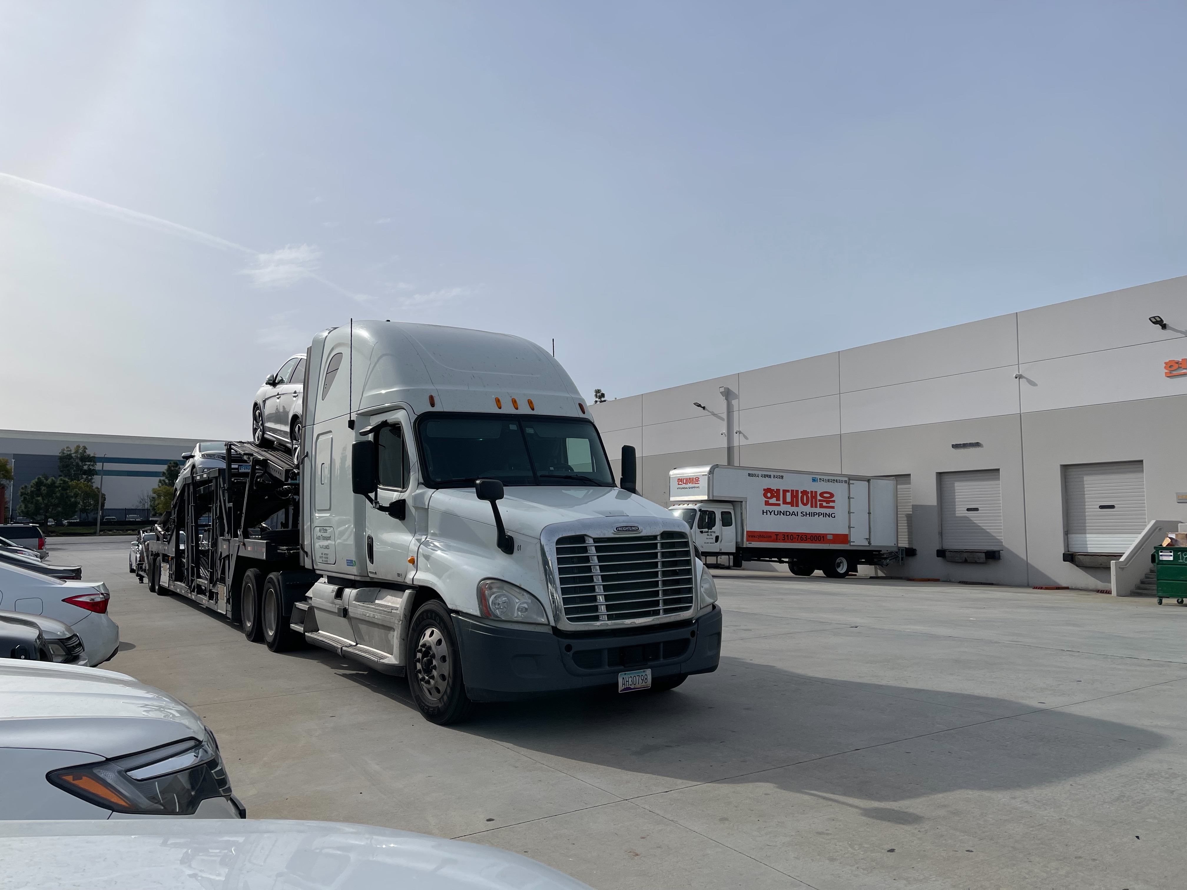 미국 캘리포니아 LA에 위치한 현대해운 미주본부 물류센터에서 컨테이너 로딩 중인 자동차 귀국이사화물 중 다양한 모델의 국산 브랜드의 자동차들을 볼 수 있습니다.