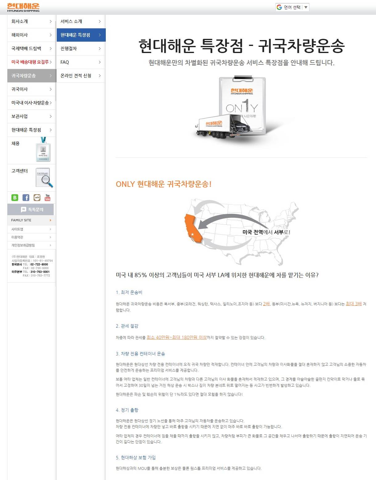 현대해운 LA 미주본부는 귀국차량운송비용 1477달러로 부담 없고, 2대의 자동차 화물만 하나의 컨테이너에 싣기 때문에 안전합니다.