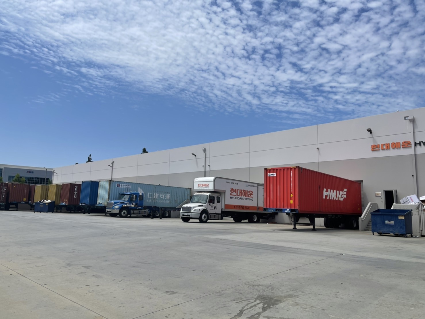 미국 캘리포니아 LA에 위치한 현대해운 미주본부 물류센터에서 컨테이너 로딩 중인 자동차 귀국이사화물 중 다양한 모델의 국산 브랜드의 자동차들을 볼 수 있습니다.